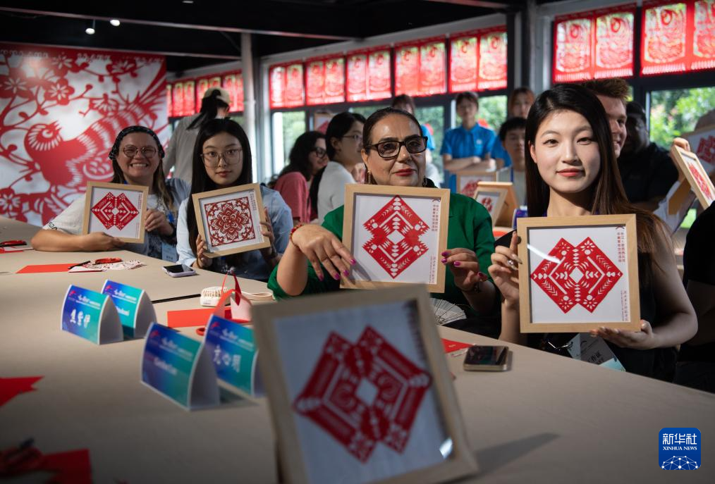 6月8日,在湖北第二師范學院,交流活動成員展示剪紙成果。