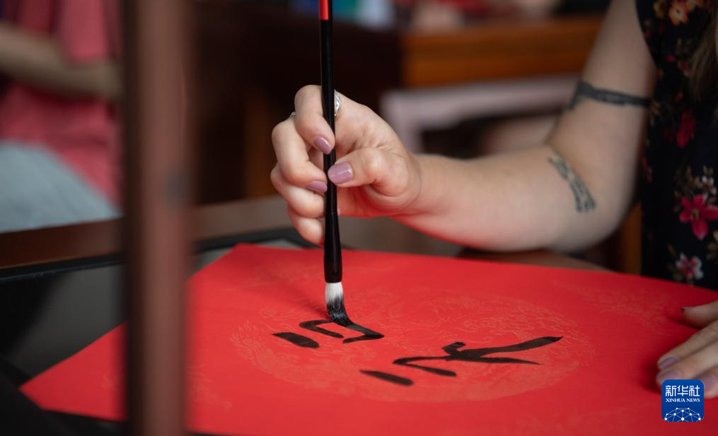 6月8日,在湖北第二師范學院,美國青年體驗書法課。