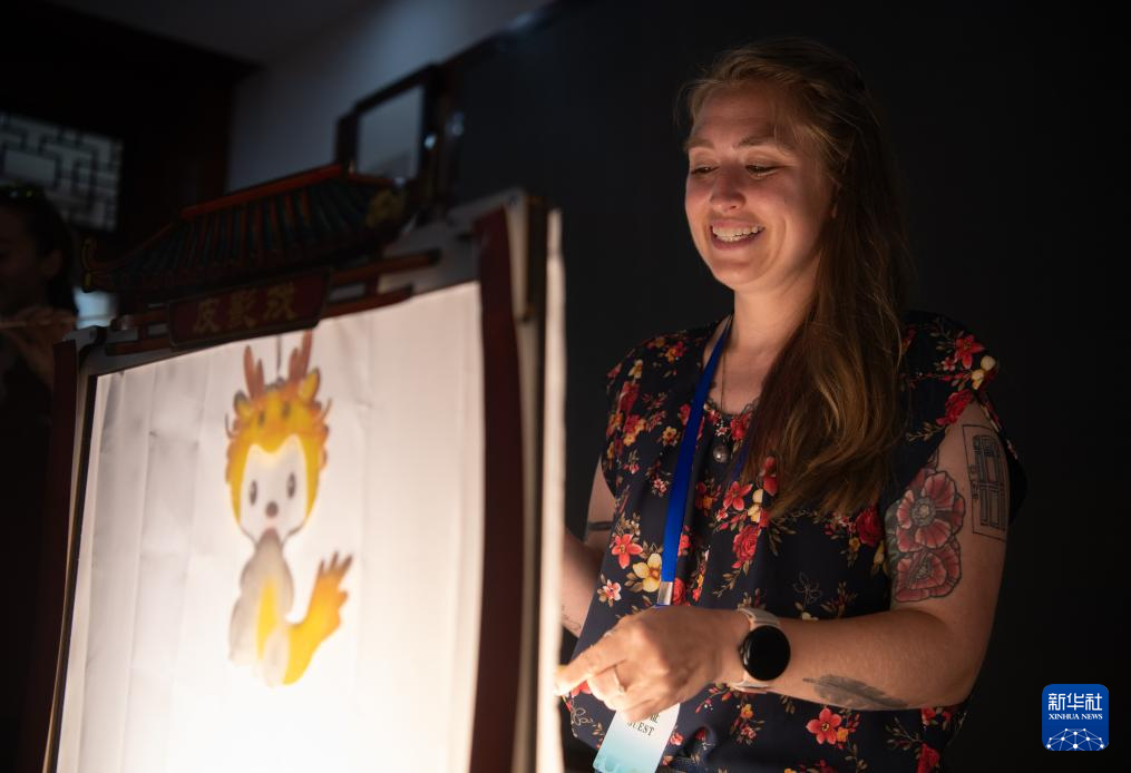 6月8日,在武漢音樂學院,交流活動成員體驗皮影戲。