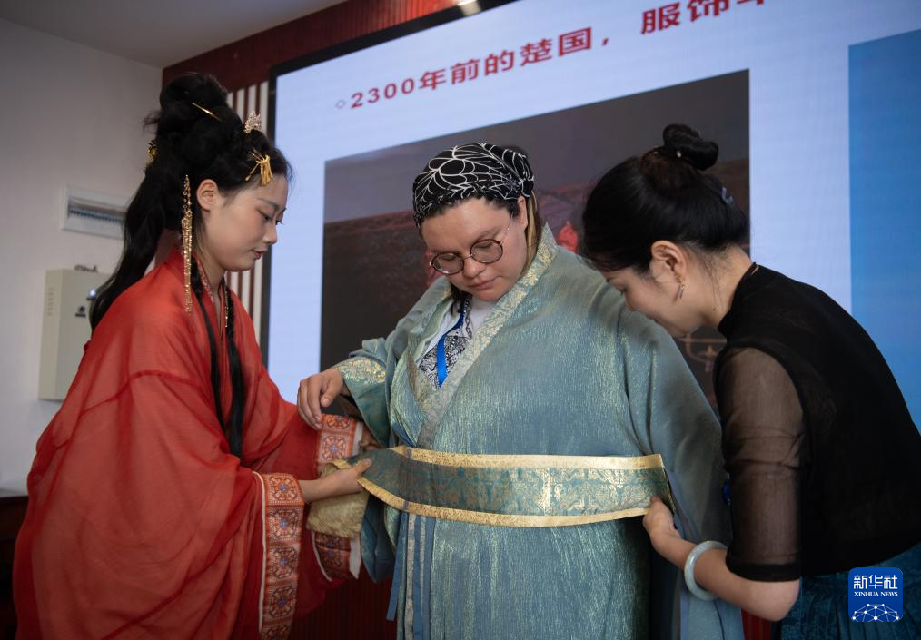6月8日,在湖北第二師范學院,美國青年體驗傳統服飾。