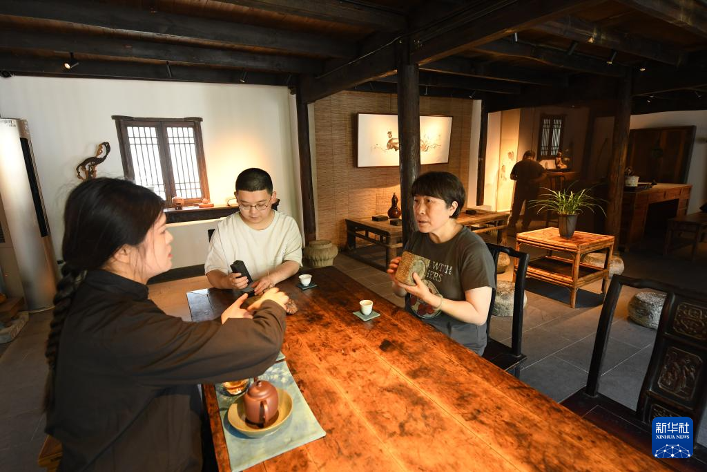 6月12日,在杭州小河直街歷史文化街區,一個文化空間的主理人焦嬌(左一)和朋友分享自己收藏的古硯。