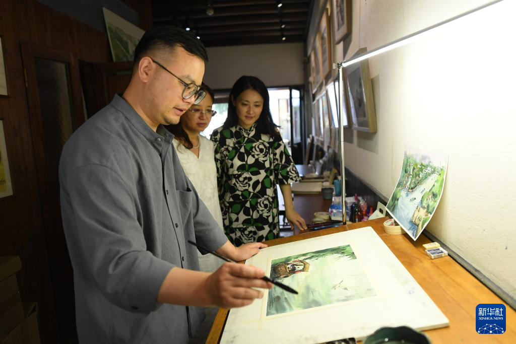 6月12日,杭州小河直街歷史文化街區,青年畫家張甜甜在工作室畫運河主題的水彩畫。
