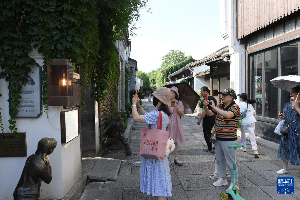 6月12日,游客在杭州小河直街歷史文化街區留影。
