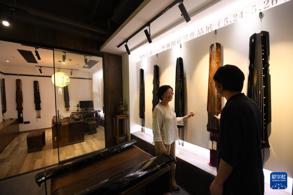 6月12日,在杭州大兜路歷史文化街區一家古琴館,工作人員向客人介紹正在舉辦的古琴展。