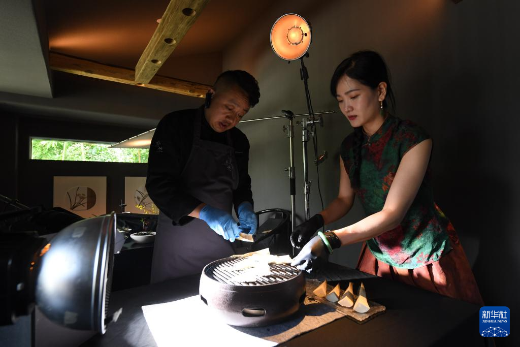 6月12日,在杭州大兜路歷史文化街區的一家素食餐廳,主理人程譯萱(右)和主廚在開發夏季時令菜品。