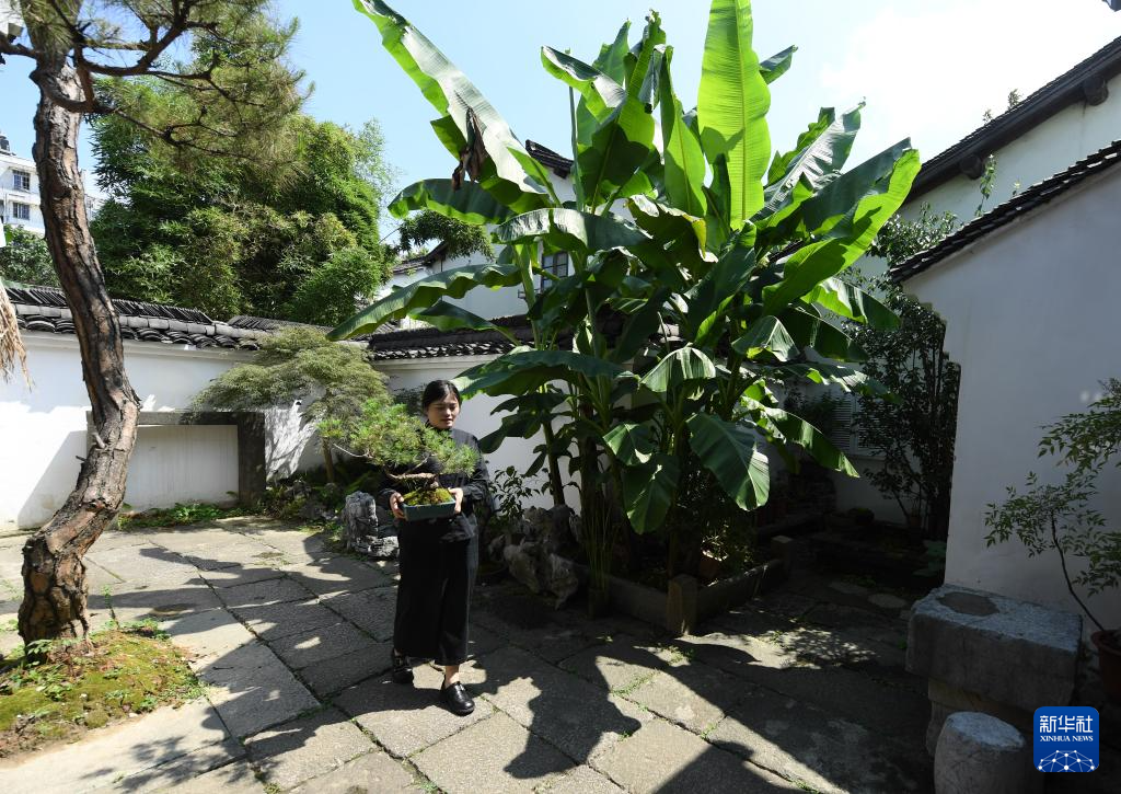6月12日,在杭州小河直街歷史文化街區,一個文化空間的主理人焦嬌在打點庭院。