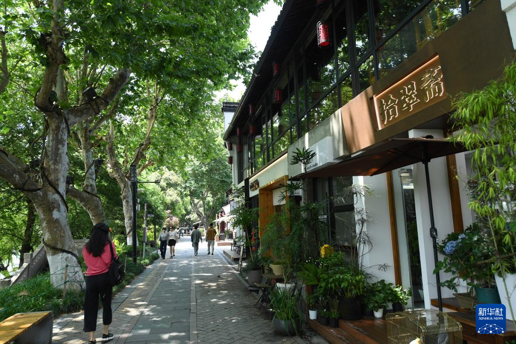 6月12日,人們在綠樹成蔭的杭州大兜路歷史文化街區游覽。