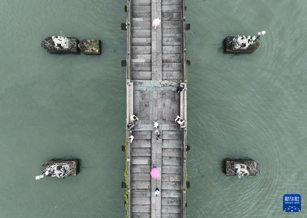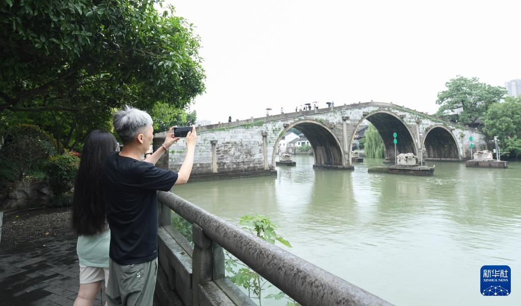 6月12日,游客在杭州小河直街歷史文化街區一座石拱橋上游玩(無人機照片)。