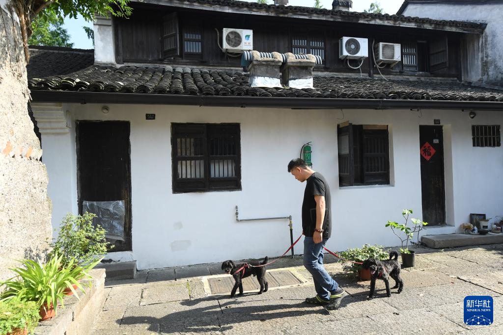 6月12日,一位居民在杭州橋西歷史文化街區遛狗。