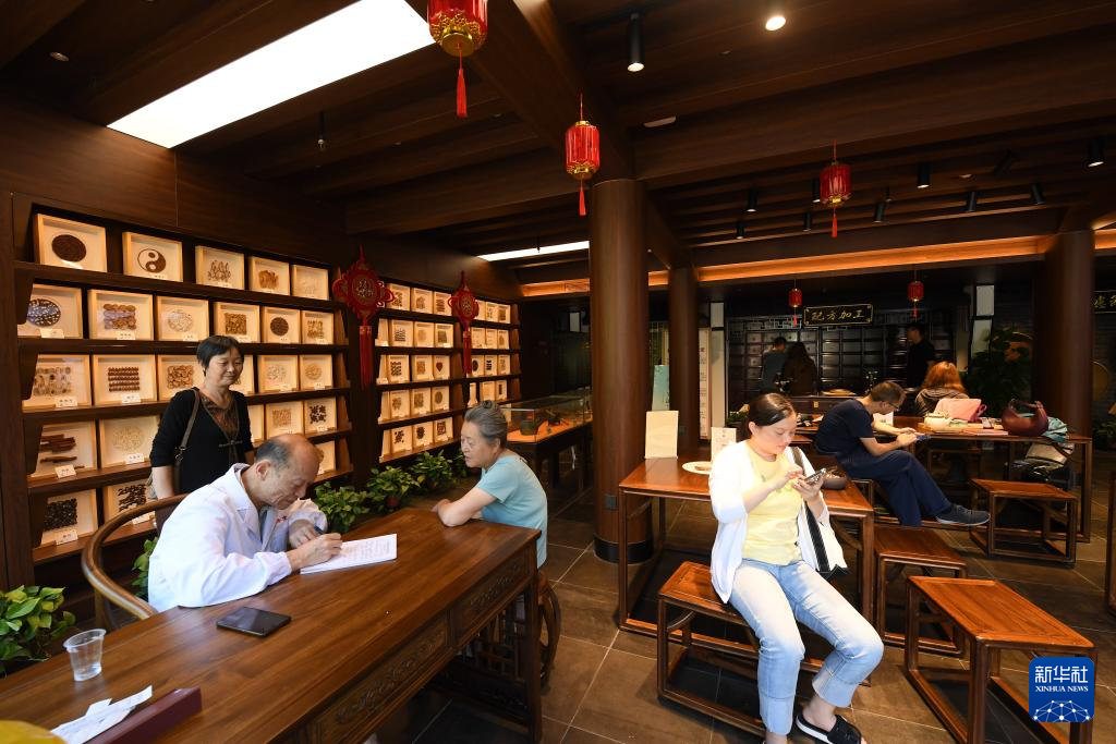 6月12日,人們在杭州橋西歷史文化街區的老字號藥店“方回春堂”問診。