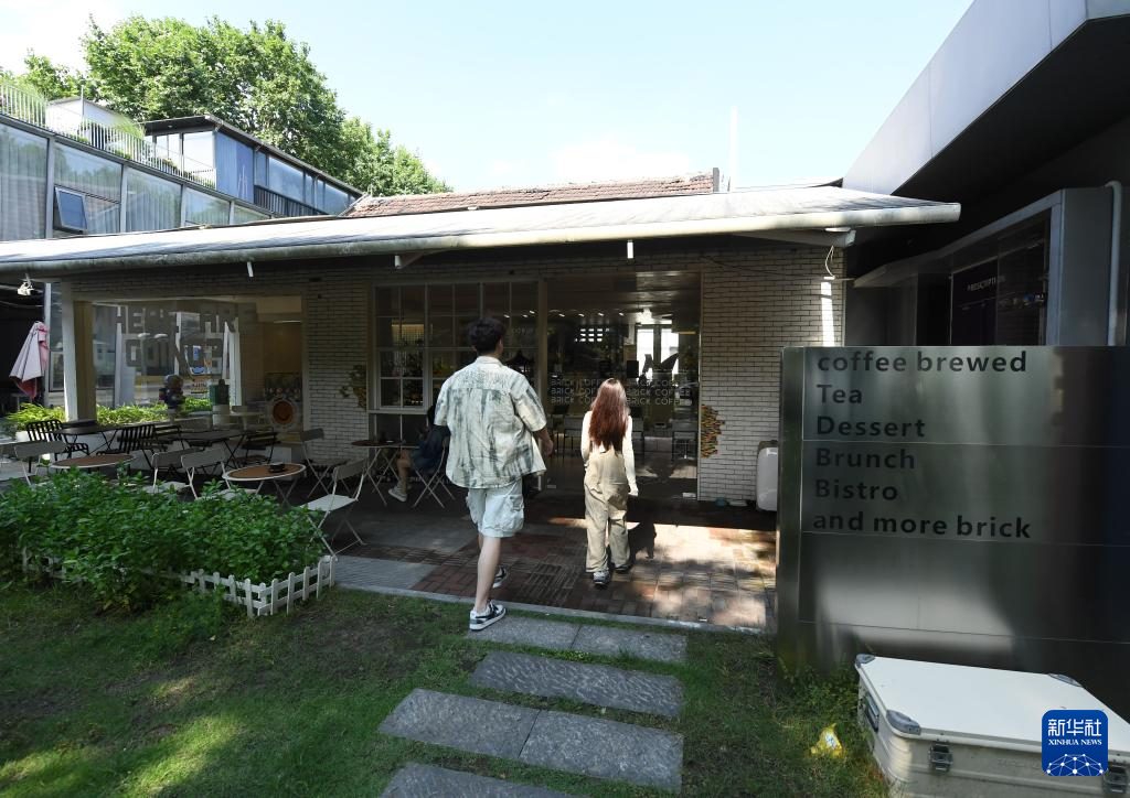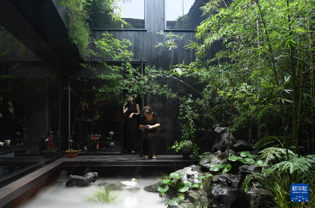 6月12日,在杭州大兜路歷史文化街區的一家素食餐廳,客人拍攝庭院風景。