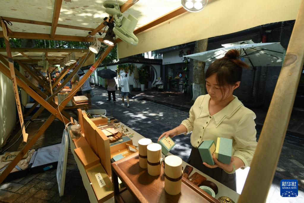 6月12日,在杭州大兜路歷史文化街區,一名市集攤主擺放創意香道用品。