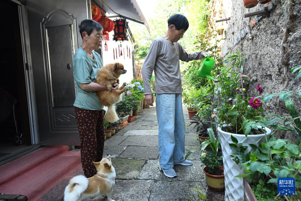 6月12日,在杭州橋西歷史文化街區,市民程贊珍、陳莉影夫婦在自家門口澆花。