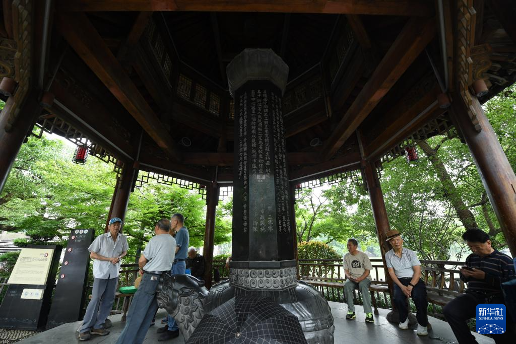 6月12日,人們在拱宸橋畔的碑亭里休憩。