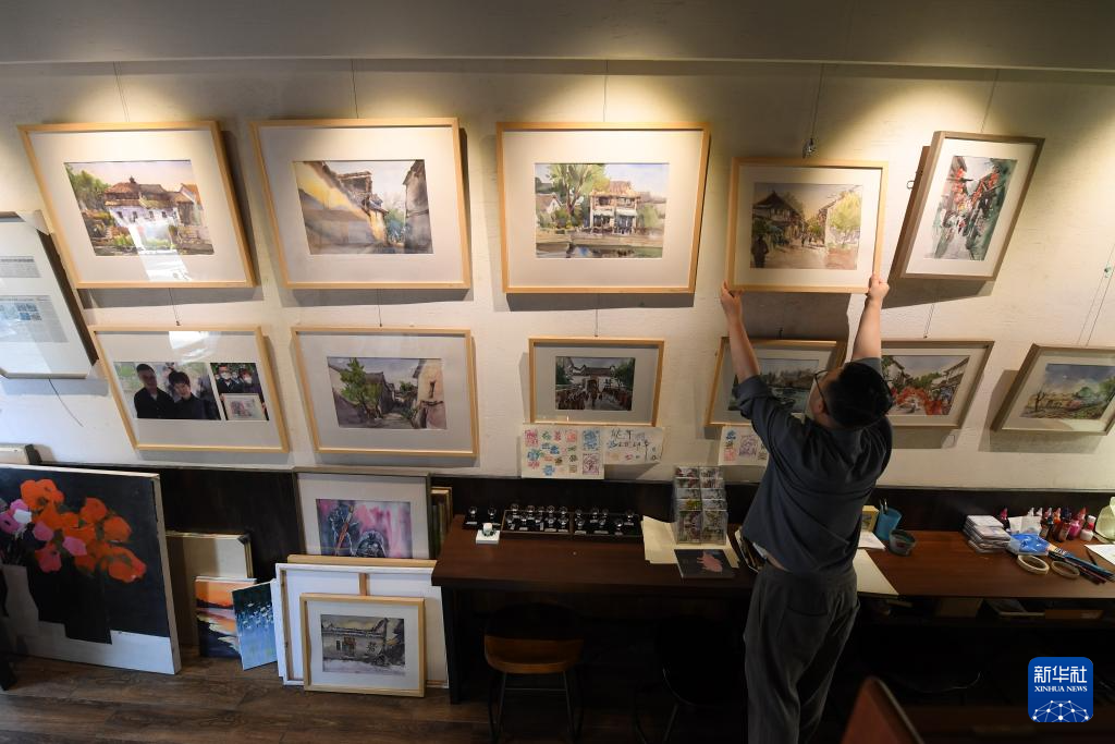 6月12日,杭州小河直街歷史文化街區,青年畫家張甜甜在工作室懸掛自己創作的運河主題的水彩畫。