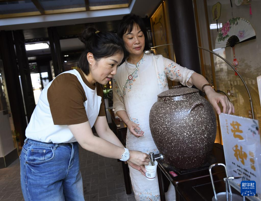 6月12日,在杭州橋西歷史文化街區的大運河國醫館,游客體驗芒種節氣茶。