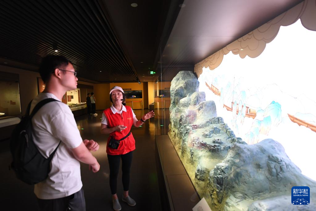 6月12日,講解員在杭州京杭大運河博物館給參觀者介紹運河歷史。