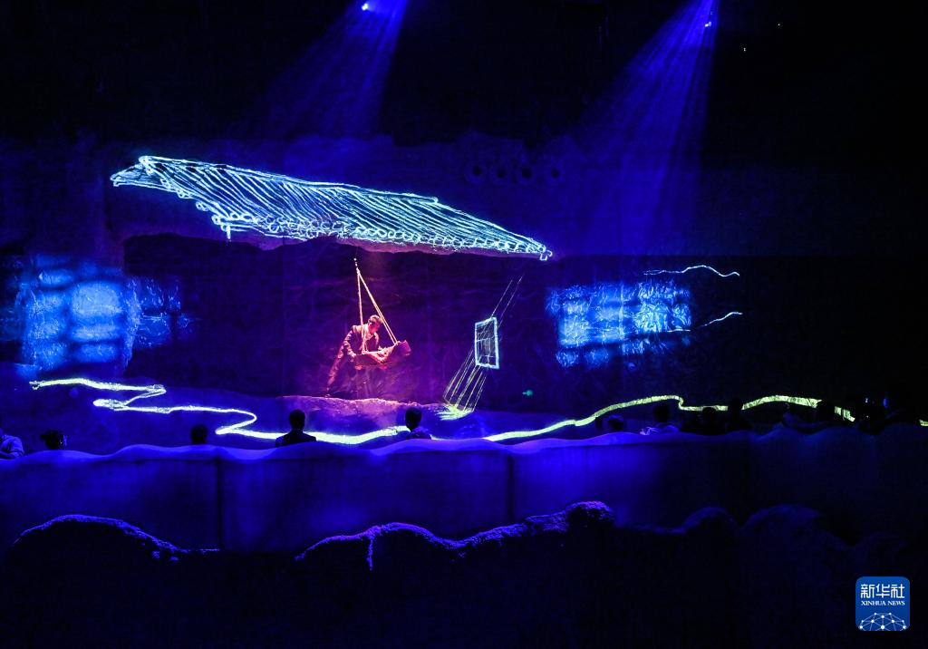 當日,在吉林省長白山北景區游客集散中心的傳奇小鎮劇場,大型真人沉浸式演藝項目《粉雪傳奇》進行首次公開演出?!斗垩﹤髌妗钒瑧騽?、舞蹈、雜技等形式,并配合以數字化多媒體技術,讓觀眾身臨其境,享受一場精彩的視聽盛宴。