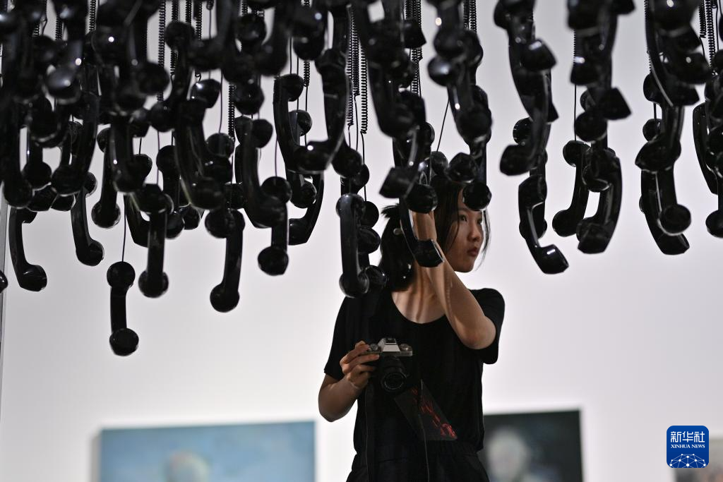 6月14日,參觀者在清華大學藝術博物館欣賞作品《回音之間》。作品中的每個聽筒播放著不同的日常電話錄音。