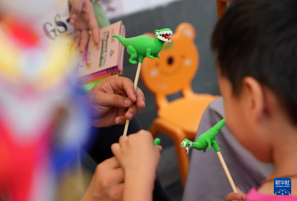 6月16日,小朋友在杭州橋西歷史文化街區一處非遺體驗點了解面塑制作技藝。