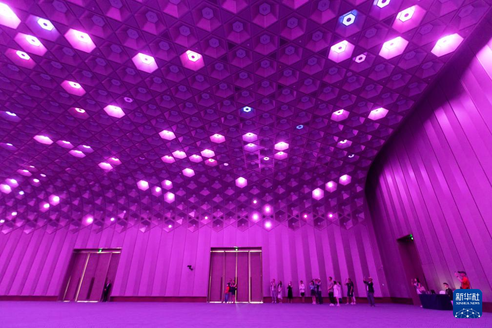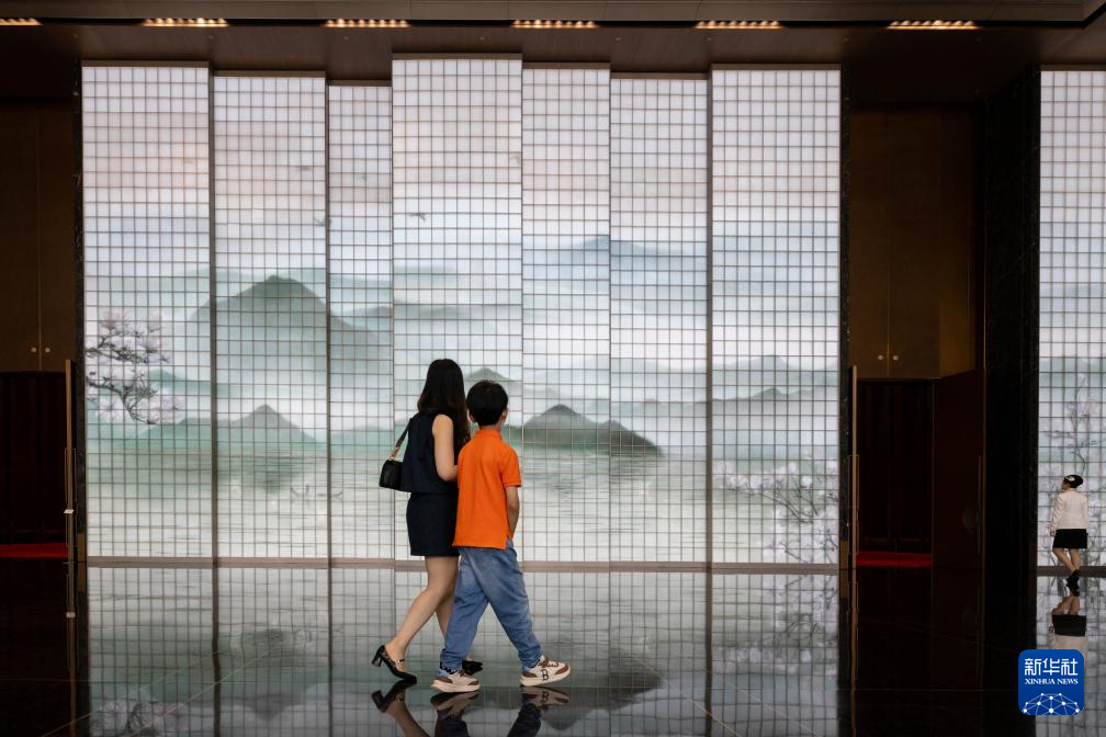 6月16日,市民經過上海世界會客廳內的琉璃多媒體藝術裝置墻。