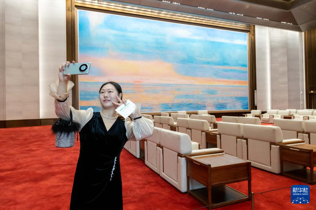 6月16日,市民在上海世界會客廳大會見廳自拍留影。