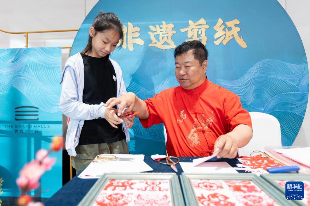 6月16日,在上海世界會客廳互動體驗區,上海市群眾藝術館剪紙師指導兒童制作剪紙。