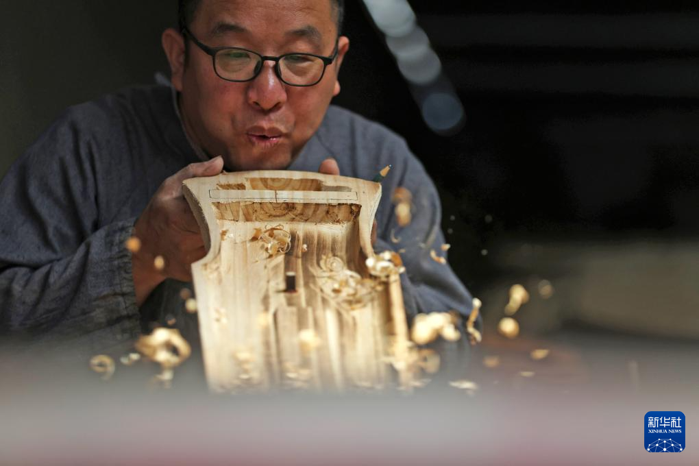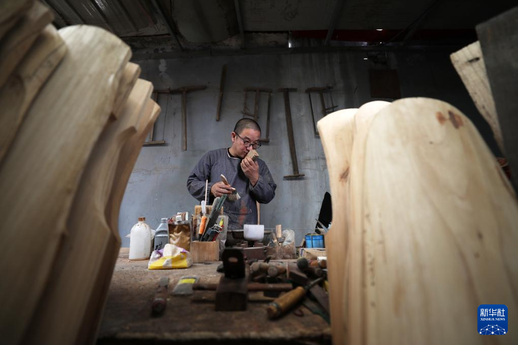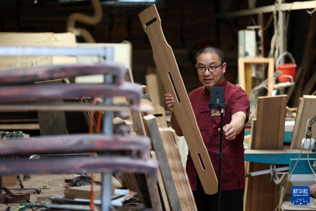 5月9日,在山東省臨沂市郯城縣的古琴工作室,陳乃峰通過直播展示古琴制作過程。