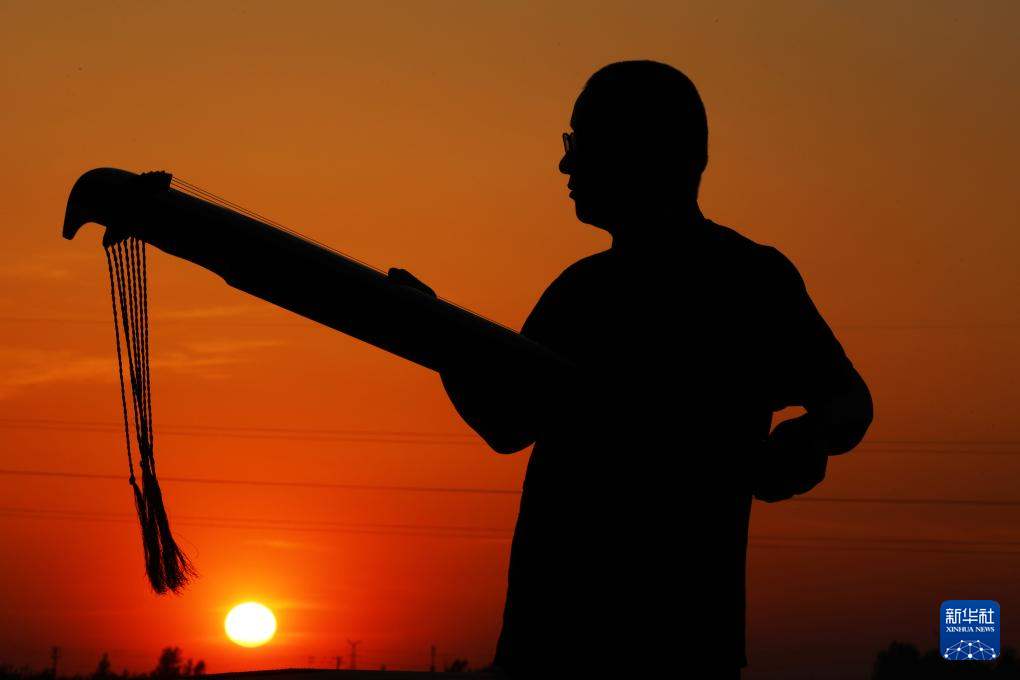 5月9日,陳乃峰在田間彈奏古琴后準備收琴。