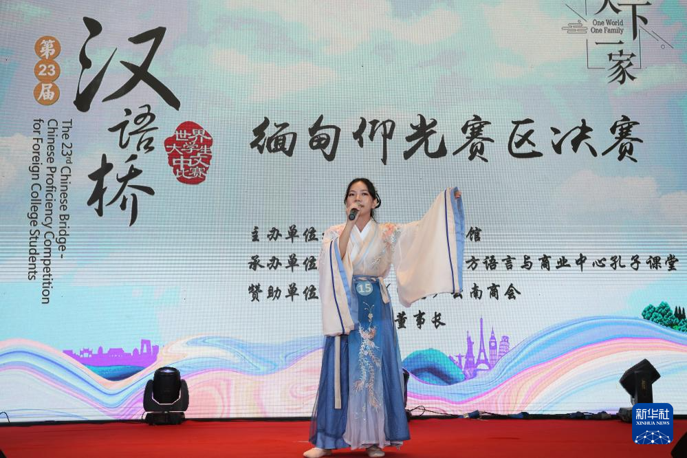 6月8日,在緬甸仰光,一名學生在“漢語橋”中文比賽仰光賽區比賽中展示才藝。