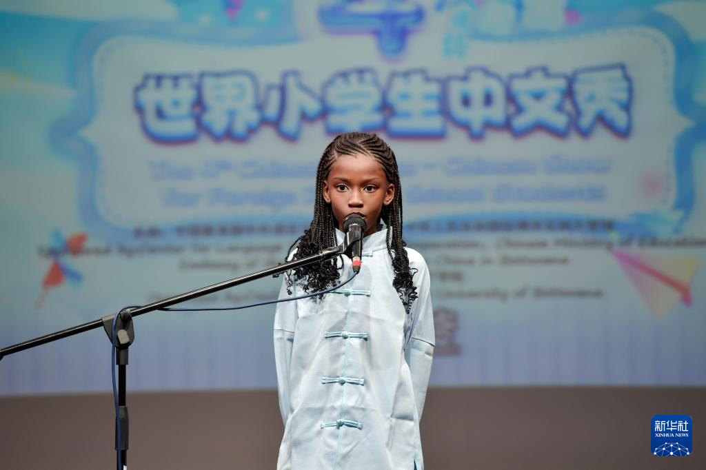 6月7日,一名選手在哈博羅內舉行的“漢語橋”博茨瓦納小學生中文秀比賽上表演朗誦。