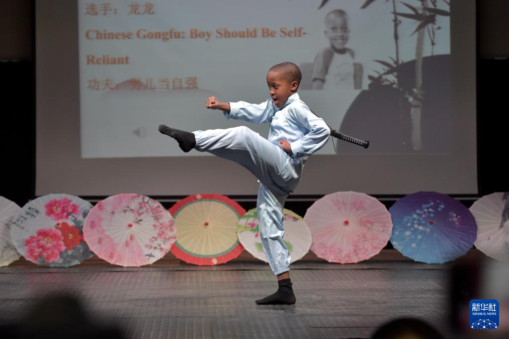 6月7日,一名選手在哈博羅內舉行的“漢語橋”博茨瓦納小學生中文秀比賽上表演中國功夫。