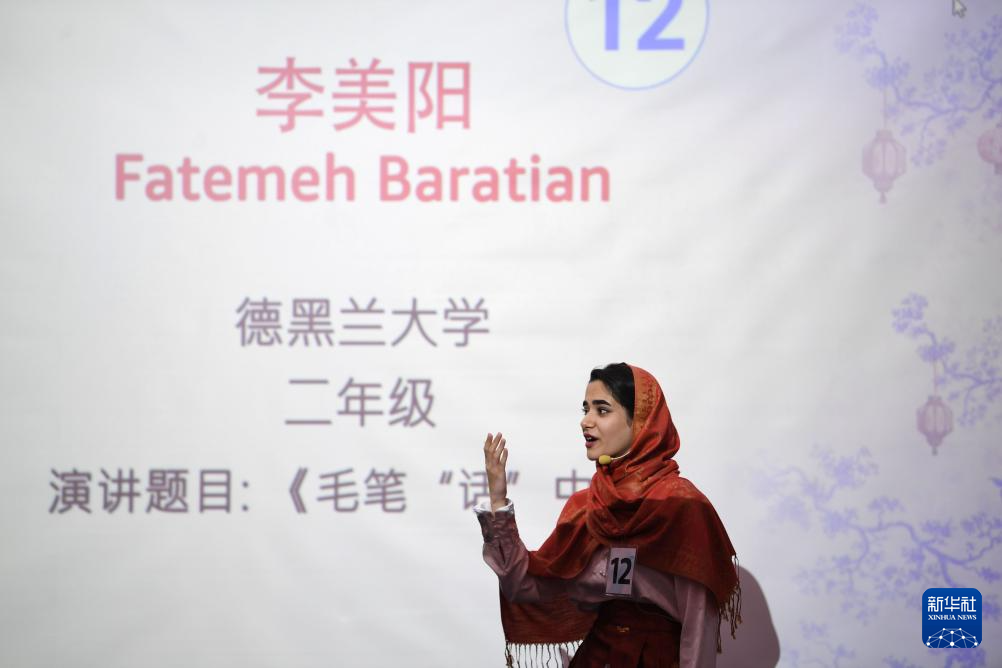 6月10日,在伊朗德黑蘭舉辦的“漢語橋”世界大學生中文比賽伊朗賽區決賽上,一名選手參加演講環節比賽。
