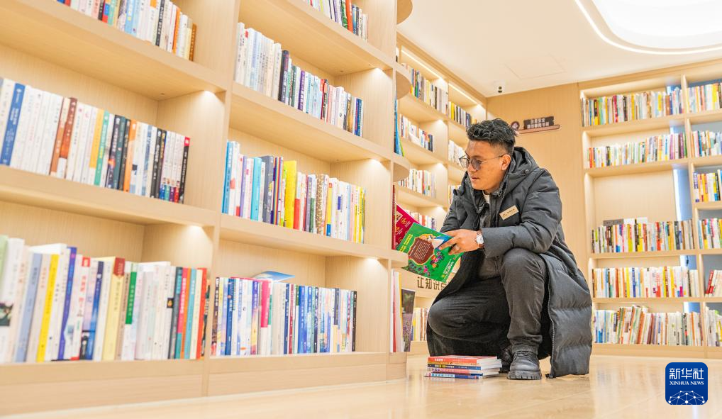 “溫暖嘉·色尼城市書房”管理員白瑪扎西正在整理書籍(6月17日攝)。