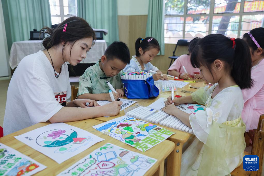 6月20日,在龍泉街道天使幼兒園,老師帶著孩子們繪制夏至傳統圖畫、制作夏季護苗綠書簽。