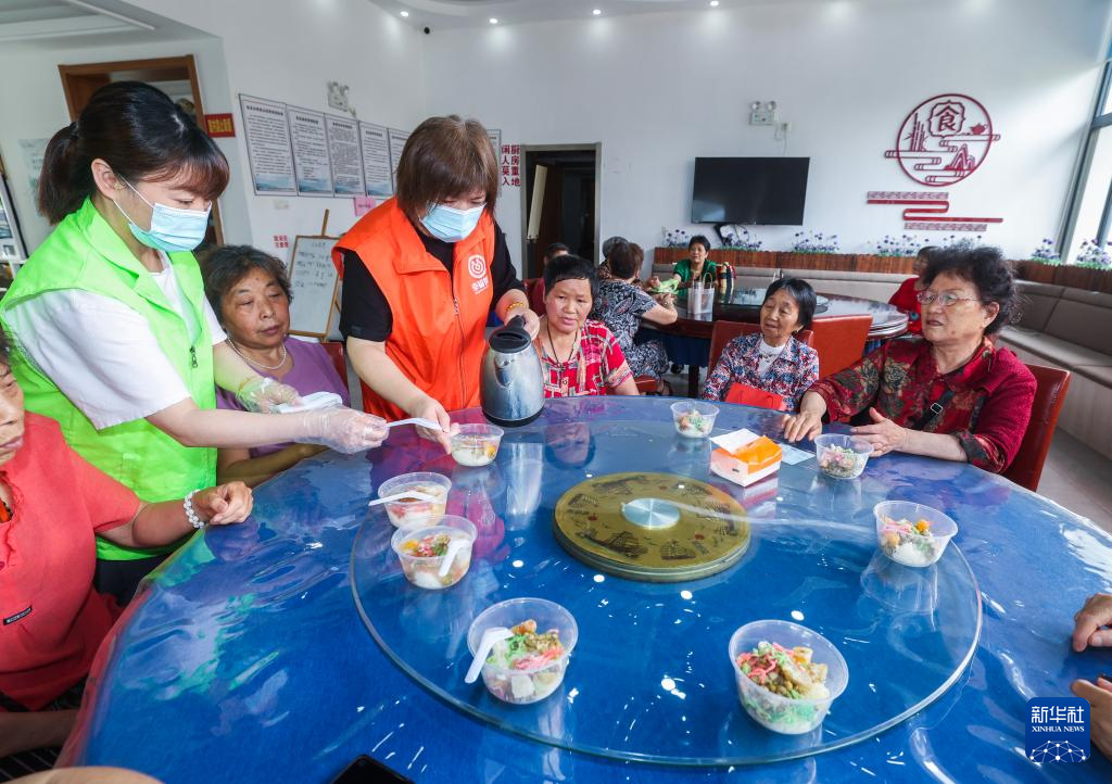 6月20日,在龍泉街道老年食堂內,志愿者在給老人們準備當地特色的消暑食物“多樣湯”?!岸鄻訙笔呛菹募緜鹘y美食,由蜜棗、金桔、紅絲綠絲、冬瓜糖、薄荷水等制作而成。