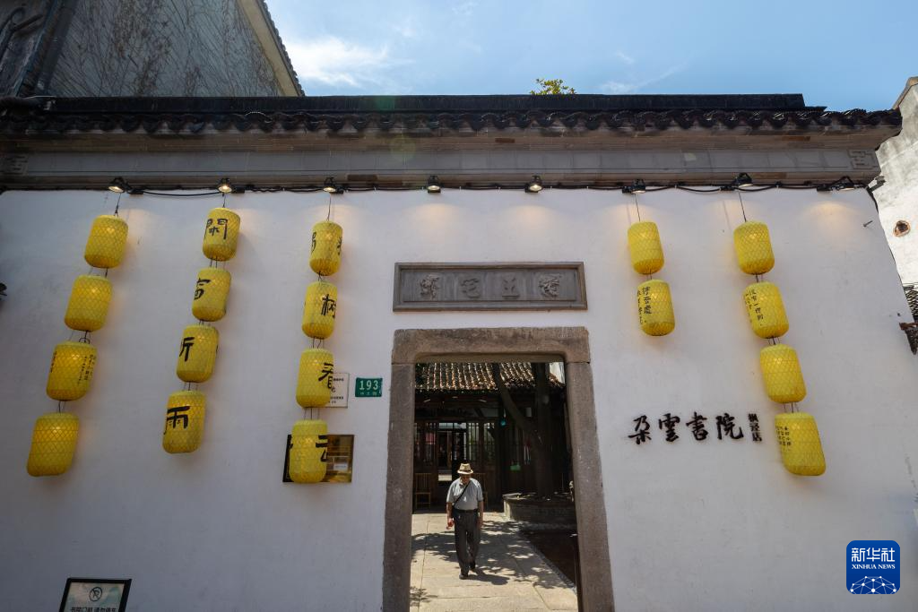 楓涇古鎮有39座始建于元明清時期的古石橋以及近5萬平方米的古建筑群,既有修舊如舊的靜態保護,也有文化鑄魂的活態傳承。古鎮核心區中大街上的王氏老宅外立面還是小青瓦、觀音兜、屏風墻,里面也維持著三進合院式布局,現由集書房、展廳、咖啡、文創于一體的朵云書院運營。出門走不遠,另一座老宅被改造成楓涇丁蹄非遺文化展示館,展示了當地丁蹄制作的傳統技藝,既帶領人們探尋舌尖上的文化之旅,也實實在在幫古鎮各處售賣楓涇丁蹄的本地商戶“帶貨”。