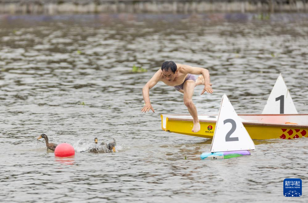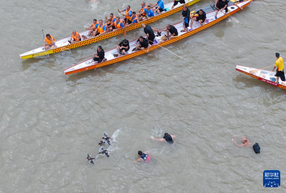 6月23日,群眾在五通橋區小西湖里搶鴨子(無人機照片)。