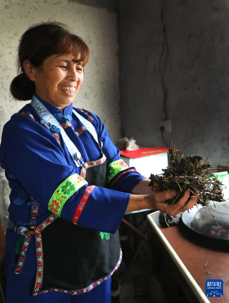 在廣西龍勝各族自治縣偉江鄉布弄村,村民蒙己秀展示用于打油茶的茶葉(6月26日攝)。