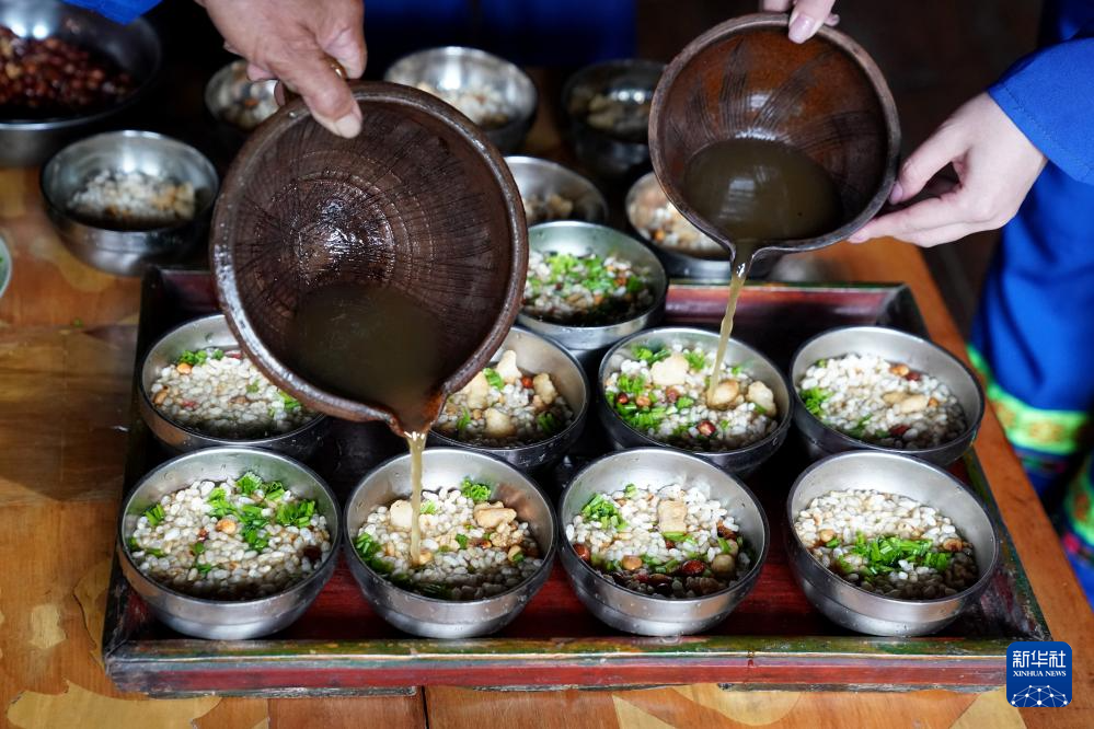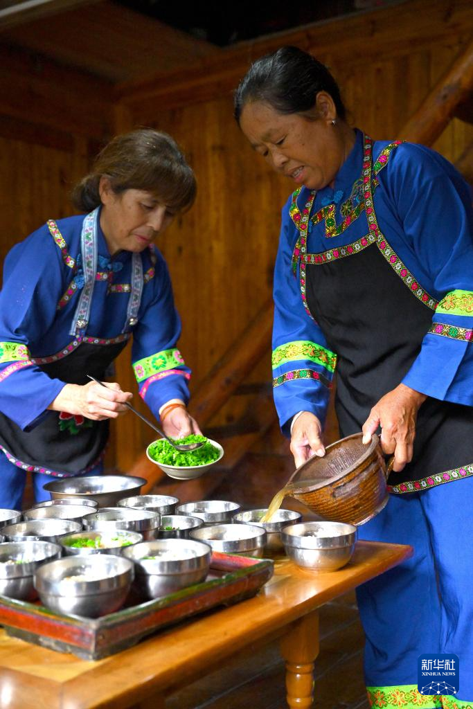 廣西龍勝各族自治縣偉江鄉布弄村,村民為客人準備油茶(6月26日攝)。