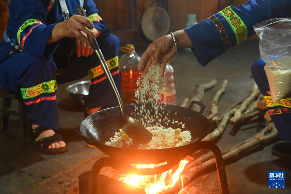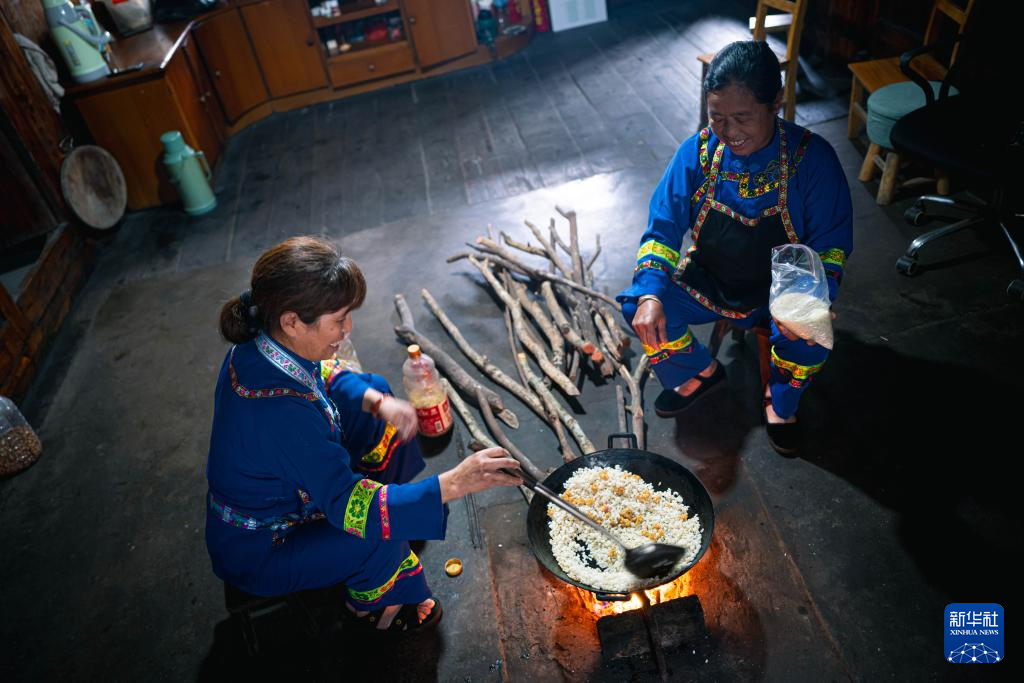 在廣西龍勝各族自治縣偉江鄉布弄村,村民蒙己秀(左)和蒙銀花在炒米花準備打油茶(6月26日攝)。