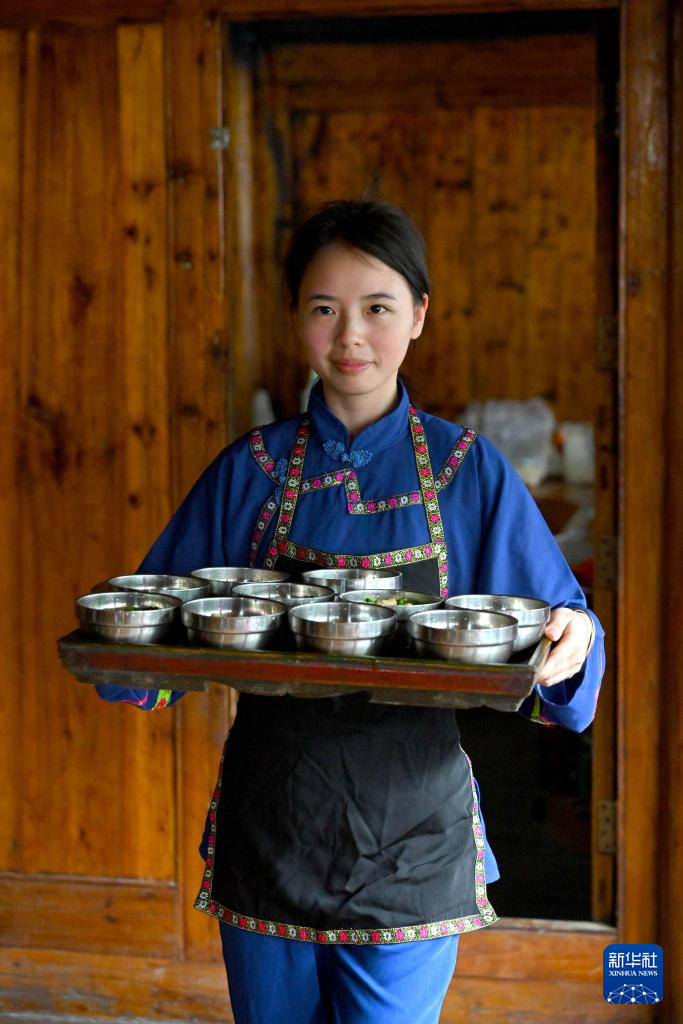 在廣西龍勝各族自治縣偉江鄉布弄村,一名女子為客人端上煮好的油茶(6月26日攝)。