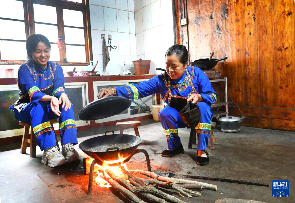 在廣西龍勝各族自治縣偉江鄉布弄村,村民蒙銀花(右)查看油茶煮制情況(6月26日攝)。