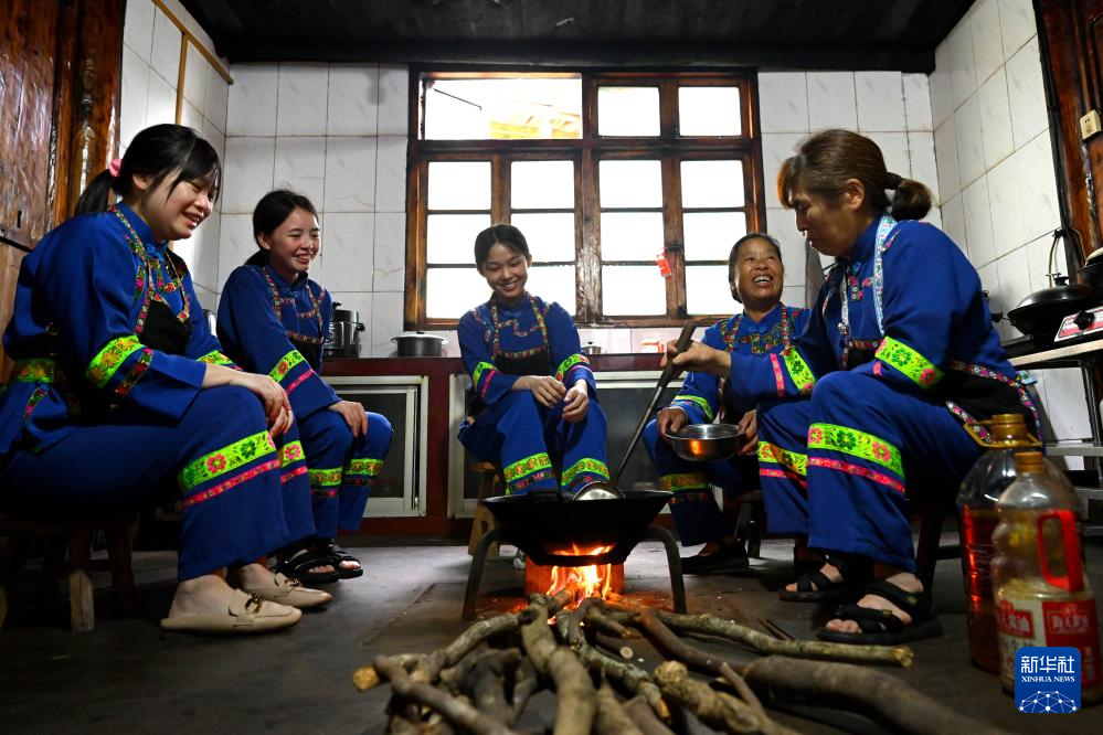 在廣西龍勝各族自治縣偉江鄉布弄村,人們圍在一起打油茶(6月26日攝)。