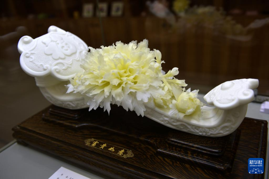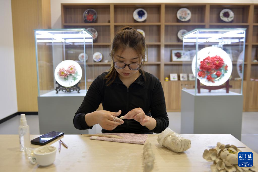 6月27日,工藝師在菏澤非遺傳承館制作3D立體牡丹陶瓷作品。新華社記者 劉力航 攝