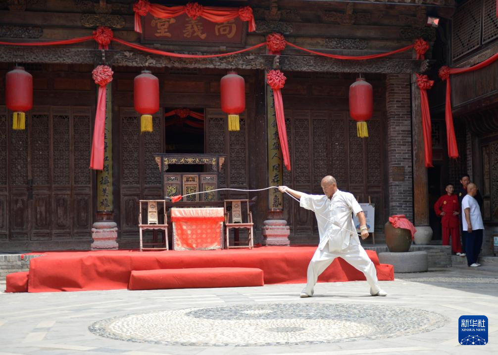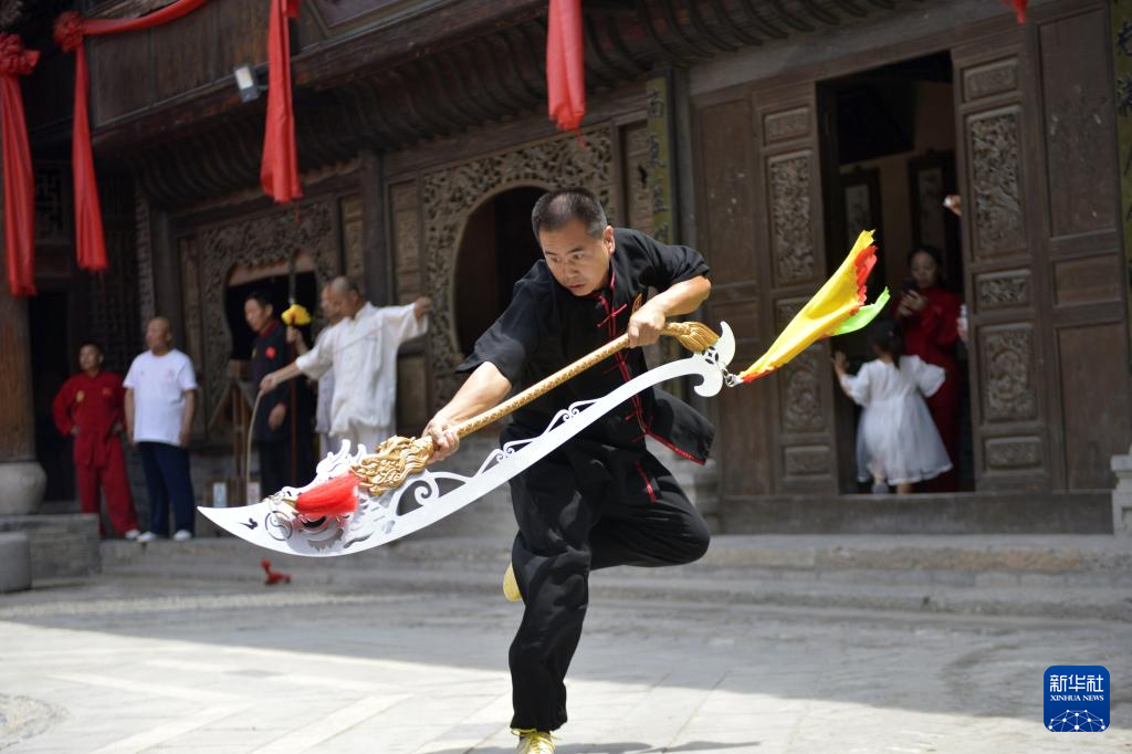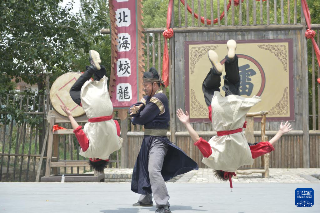 6月27日,武師在菏澤鄆城水滸好漢城表演武術。新華社記者 劉力航 攝