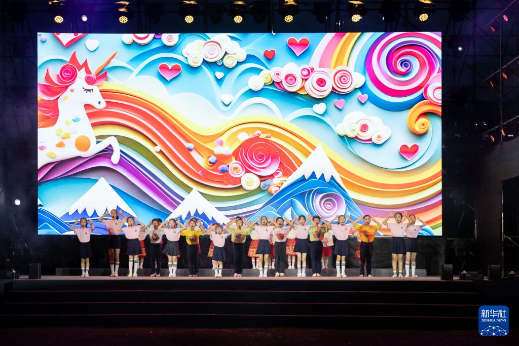 7月2日,上海師范大學附屬閔行第三小學合唱社團與浦錦街道童聲合唱團共同演唱歌曲。