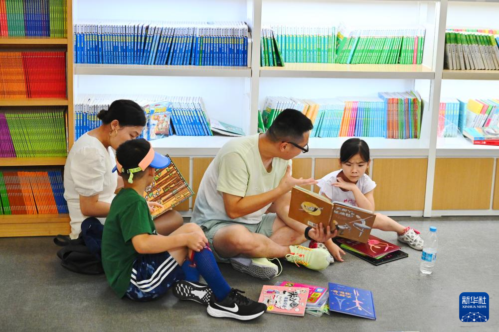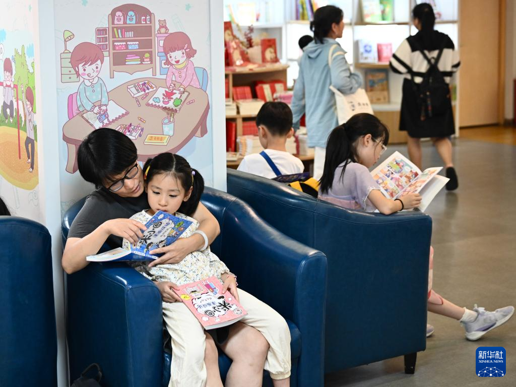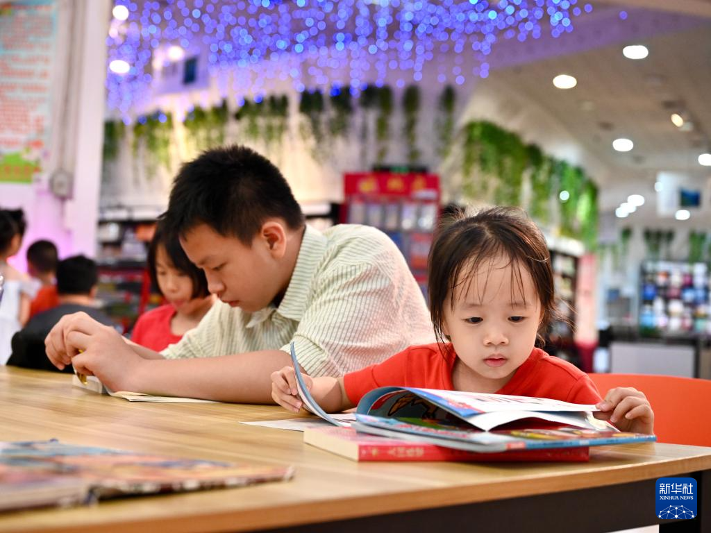 7月6日,福州新華書店鰲峰坊書城內家長陪伴孩子讀書納涼。
