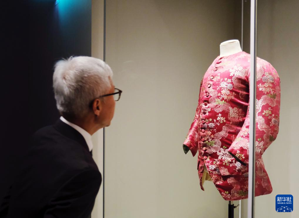 香港故宮文化博物館館長吳志華在仔細觀看一件圖案紋飾帶有“中國風”的18世紀法國男性貴族穿著的紅色半長外套(6月25日攝)。新華社記者 王申 攝