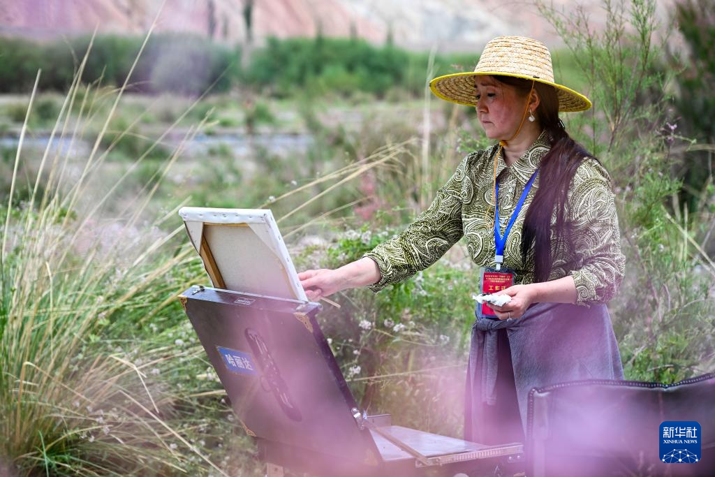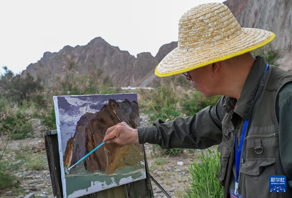 7月4日,在新疆克州阿圖什市周邊,小分隊文化志愿者在寫生創作。